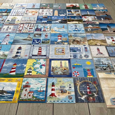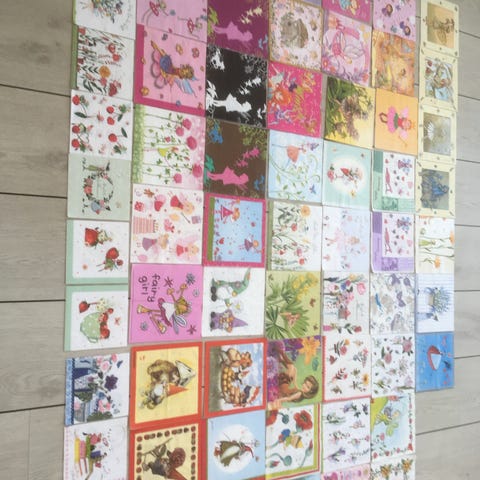 Servietter med solsikke-motiv i blandede farver og designs. Motiverne viser forskellige solsikker og relaterede illustrationer i gule, grønne, blå, røde og andre nuancer. Egnet til borddækning, hobbyprojekter og decoupage, hvor der ønskes et blomster- og solsikke-tema.