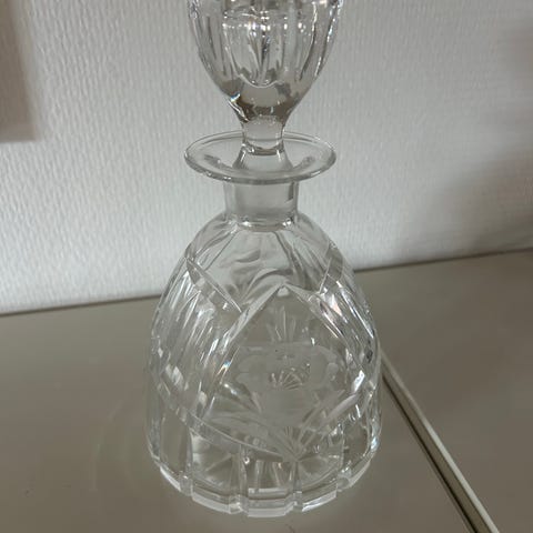 Klar glas karaffel med slibninger og matchende glasprop. Karaffelen har konisk form med dekoreret bund og mønster i glasset. Velegnet til servering og opbevaring af fx vin eller spiritus.