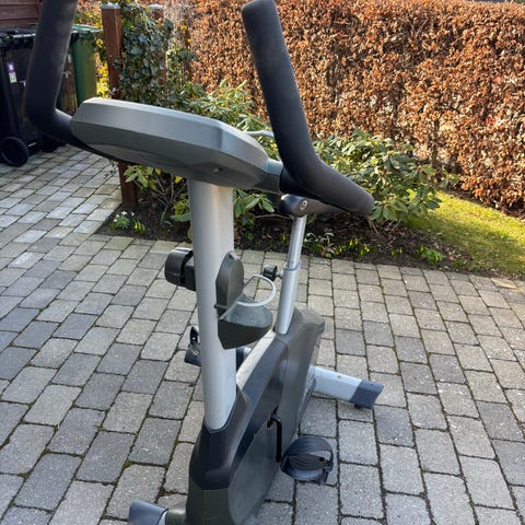 Nautilus Commercial Series motionscykel. Stationær kvalitets træningscykel med elektronisk display og betjeningspanel med flere knapper og programmer. Har Cyklen har justerbart sæde, brede pedaler med fodstropper (den ene er desværre gået i stykker) samt håndtag med indbyggede sensorer. Egnet til indendørs konditionstræning. Farven fremstår i mørke nuancer med lyse detaljer.