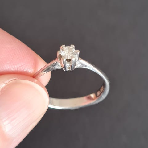 Prinsesse ring i hvidguld med diamant. Ringen har en enkeltstensfatning, hvor diamanten er placeret centralt. Materialet er angivet som hvidguld med diamant som hovedmateriale i stenen. Velegnet som eksempelvis forlovelsesring eller som klassisk smykkering.