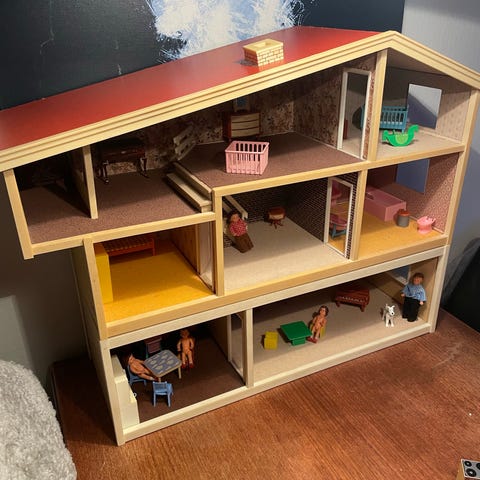 Lundby dukkehus med flere etager i rimelig stand. Tilhørende møbler i Lundby stil men også tilført en del flere møbler.