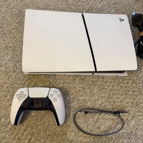 Sony Playstation 5 konsol i hvid farve. Konsollen er vist sammen med en trådløs DualSense-controller i matchende hvidt og sort design. Velegnet til gaming med understøttelse af moderne spil og tilslutning til tv eller skærm via HDMI.