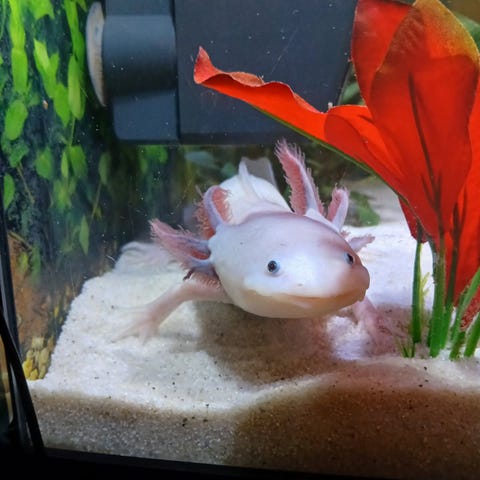 660 liters akvarium med 3 udtryksfulde axolotler (2 hunner og en han- han er den ene af de melerede), indrettet med sandbund, dekorationsten, snegle, muslinger, 3D baggrund og levende planter. Akvariet har tydelige brugsspor (vi købte det brugt), men det er 100% vandtæt.