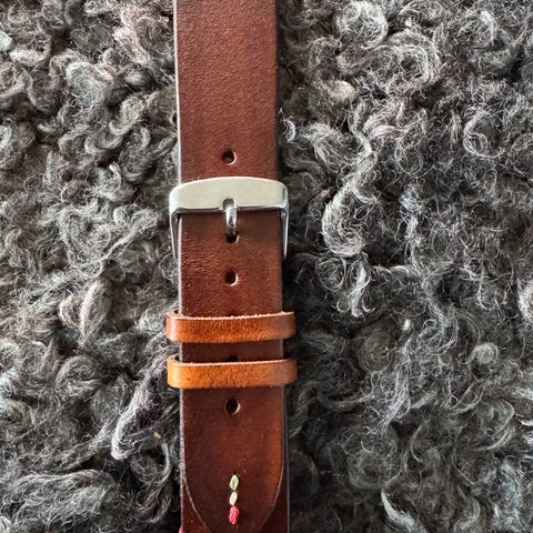 Remmen er i semimat sort alligator med præget struktur og sorte syninger. Modellen er MX000L7J og fremstillet i Østrig.