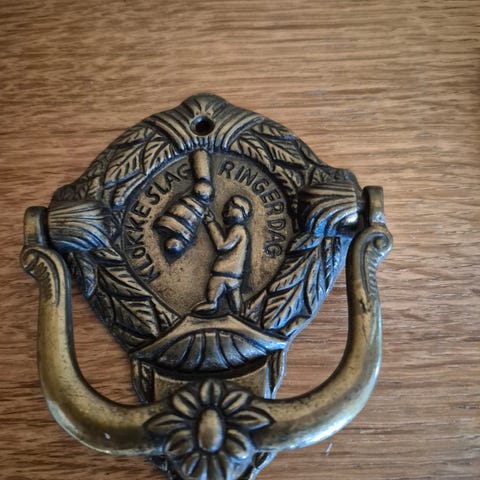 Dørhammer i blåmalet metal med englemotiv øverst og dekorativt mønster på pladen. Monteres på dør med skruer gennem de eksisterende skruehuller på bagsiden. Velegnet som funktionel dørhammer eller som dekorativt element på en hoveddør eller indvendig dør.
