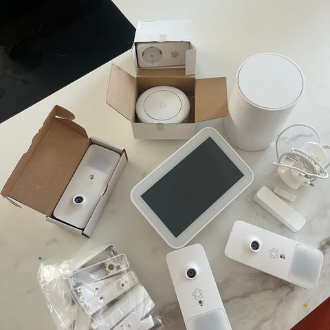 Verisure alarmsystem sæt i hvid. Sættet omfatter forskellige komponenter og enheder til trådløs alarm, herunder centralenhed, betjeningspanel, smartkamera, night control, overfaldsalarm, røgalarm, vibrationsdetektor, nøglebrik, åbningskontakter, bevægelsesdetektor, klimadetektor, kameradetektor, fotodetektor, smartplug, hub, vanddetektor, sirene, voicebox, røgkanon, pir, kamera, batterier, strømforsyninger, kabler og tilbehør. Systemet er egnet til brug i bolig eller mindre erhverv, hvor der ønskes overvågning af f.eks. døre, vinduer og røgudvikling. De enkelte enheder er designet til indendørs montering og kommunikerer trådløst med centralenheden.