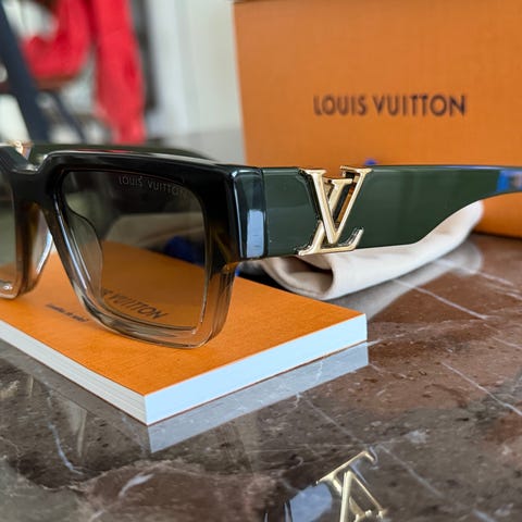 Louis Vuitton solbriller til mænd. Modellen har store, rektangulære glas med let tonede linser og metalstel. Stængerne har karakteristisk Louis Vuitton-mønster. Leveres med opbevaringsetui og stofpose, som ses på billederne. Brugt få gange. Fejler ikke noget. Kvittering medfølger desværre ikke da den ikke kunne findes.