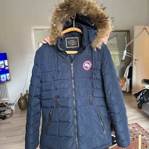 Canada Goose vinterjakke til kvinder i størrelse S. Jakken er marineblå og foret med dun. Den har hætte med pelskant, flere frontlommer og ribkant ved ærmerne. Trænger til en rens.