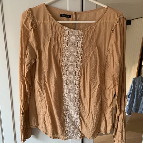 Stella Nova skjorte til kvinder i str. S. Skjorten er i beige silke med knaplukning foran. Modellen har lange ærmer med blonde-detaljer, afrundet kant forneden og let løs pasform. Velegnet til hverdagsbrug eller mere formelle anledninger afhængigt af styling.