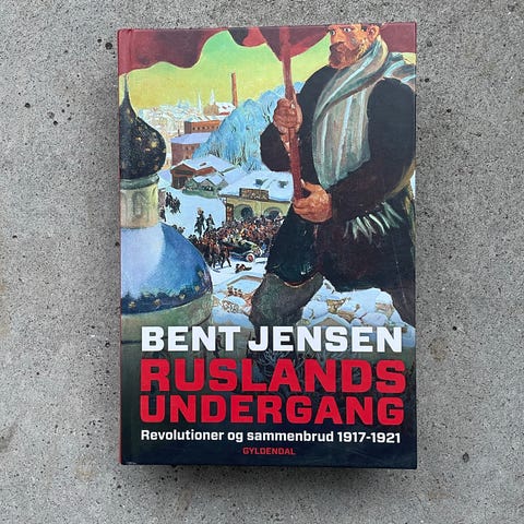 Bent Jensen "Ruslands undergang – Revolutioner og sammenbrud 1917-1921" bog. Faglitterær historisk bog om Rusland og revolutionerne i perioden 1917-1921. Indbundet udgave på dansk med indholdsfortegnelse og bagtekst, der gennemgår bogens temaer og kapitler om revolution, borgerkrig og politiske omvæltninger i Rusland.