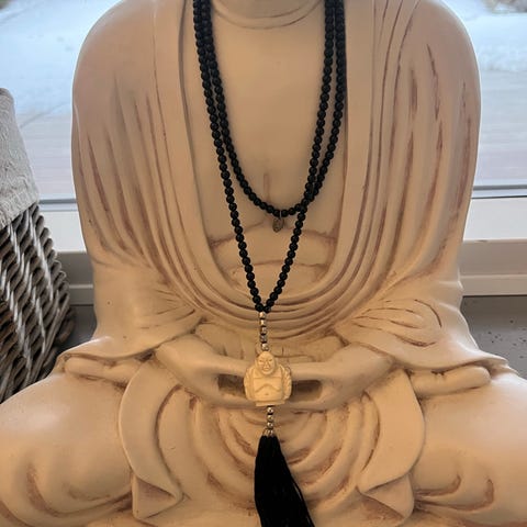 Flot halskæde med et stort vedhæng med en BABY Buddha. Se for- og bagside på billede nr. 3. Vedhænget er OBSIDIAN og det måler 3x5 cm. Kæden af 6 mm og mindre sorte glasperler er 61 cm. Halskæden er helt ny. Vægt 50 gram