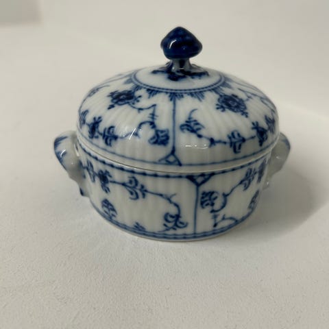 Royal Copenhagen Musselmalet Riflet skål i hvidt porcelæn med blå dekoration og nummeret 580.