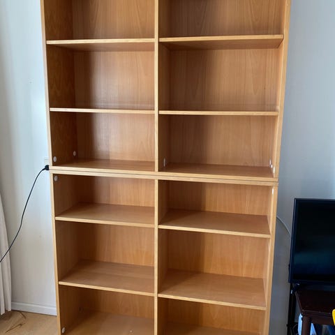 3 reoler i bøg gives bort (ikke massiv bøg). De 2 store er 202 cm høje, 60 cm brede og 29 cm dybe. Den ene har udskæringer i bagbeklædningen til ledninger, men det ses ikke når den er fyldt. De er solide og med solide “dutter” til at holde hylderne. Den lille er 85cm høj, 69cm bred og 29 cm dyb.