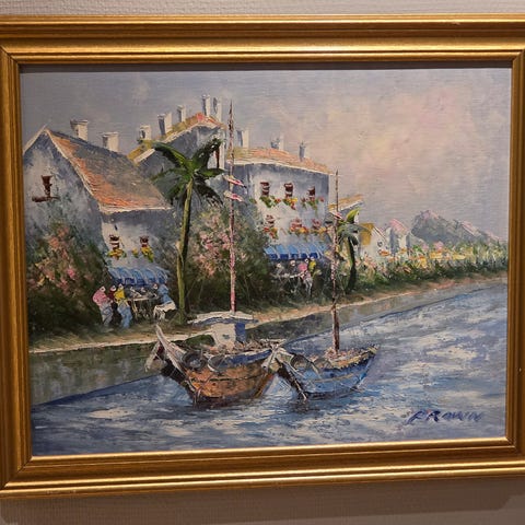 Maleri af rødt stråtækt hus. Fin guldramme.