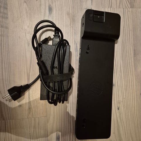 HP dockingstation til bærbar computer med tilhørende strømkabel og skærmkabel. Egnet til tilslutning af bærbar computer til eksterne skærme og andet tilbehør via dockingløsning. Velegnet som ekstra base på skrivebordet eller som reserve-dockingstation.