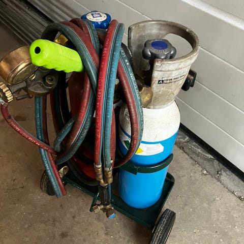 gas og ilt sæt på vogn med 5 kg ejerflasker helt nye og fyldte kasse med diverse dyser og brænder