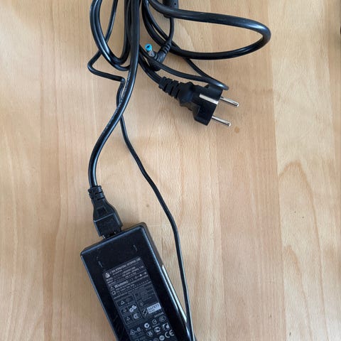 Strømforsyningsadapter i sort. Adapteren har fastmonteret strømkabel med stik til stikkontakt samt kabel til tilslutning af enhed. Velegnet som ekstra eller erstatningsadapter til udstyr, der passer til denne type strømforsyning. Mærke, model, effekt og stiktype er ikke angivet og bør kontrolleres før brug.