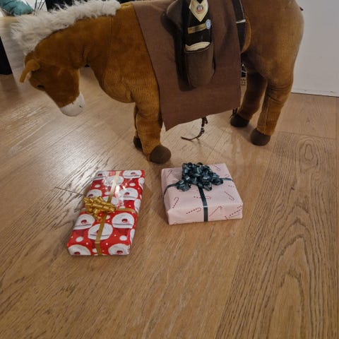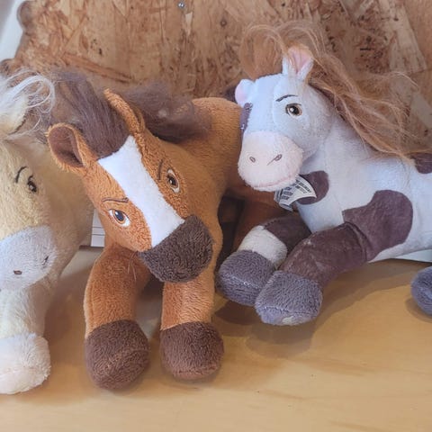 Bamse plyshest med tilhørende taske i pink, blå og guld. Hesten er blød og beregnet som legetøj til børn. Tasken har bærehanke og krone-motiv og er udformet, så hesten kan bæres eller opbevares i den. Egnet til rolleleg og som krammelegetøj.