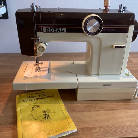 Med fodpedal, spoler, tilbehør og brugervejledning samt original emballage. Egnet til almindelige syopgaver og simple projekter i hjemmet.