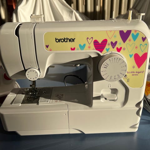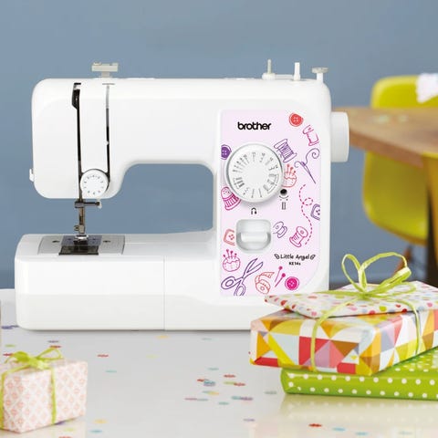Brother Little Angel KE14s symaskine i hvid med farvede illustrationer på fronten. Maskinen har drejeknap til valg af forskellige stingtyper og indbygget LED-lys ved nåleområdet.