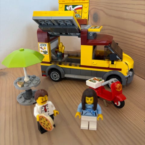 LEGO City pizzabil byggesæt. Sættet indeholder en pizzabil, scooter, lille bord med parasol samt minifigurer og tilbehør som vist på billederne. Der medfølger byggevejledninger til sættet. Velegnet som del af en LEGO City by eller til leg med mad- og gadescener.