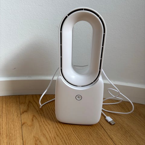 Bordventilator i hvid plast. Ventilatoren har beskyttelsesgitter foran rotorbladene og står på en rund fod, der kan placeres på bord eller hylde. Egnet til brug i hjemmet eller på kontoret til luftcirkulation i mindre rum.