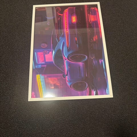 Plakat med bilmotiv i neonfarver. Motivet viser en sportsvogn i et bymiljø med stærke lilla, pink og blå nuancer. Egnet som vægdekoration i f.eks. stue, kontor eller værelse. Trykt på papir og leveres som løs plakat i ramme