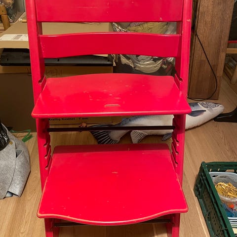 Vi sælger vores gamle, men fine røde Stokke Tripp Trapp stol. Der medfølger en plastik babyindsats, der passer til netop denne version af stolen. Samtidig er der to sæt puder, der passer til indsatsen og som er nemme at vaske.