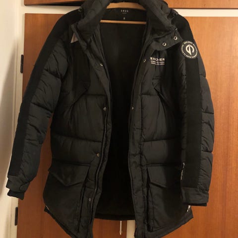 fin dunjakke sælges. Helt sort med hætte. God stand.