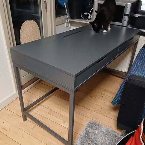 Gratis skrivebord og stol til afhentning i Ishøj. Bordet består af en træplade med ben fra ikea og str er 160cm x 50cm.
