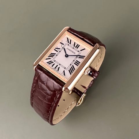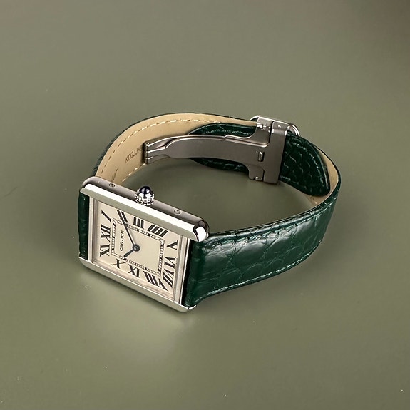 Et eksklusivt Cartier Tank Solo Large i gult guld. Uret måler 27x35 mm, er i flot stand og kommer som et fuldt sæt på en ny brun Cartier alligatorrem. Der medfølger en ny læderrem (no brand).