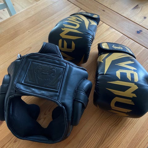 Venum boksehandsker i hvid og guld. Handskerne har lukning med velcro omkring håndleddet og er velegnede til boksning, træning og kampsport. Designet med polstring på knoerne og Venum-logo på oversiden. Velegnet til brug i boksetræning, sparring eller sandsækstræning.