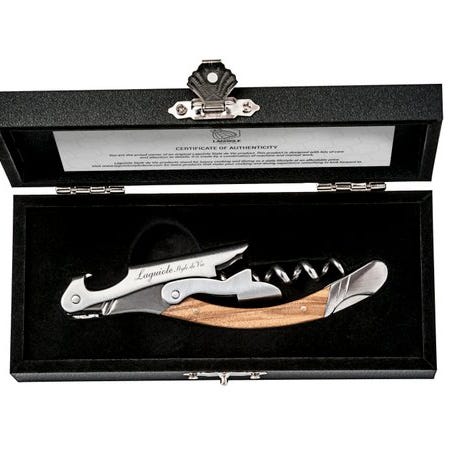 Elegant wooden wine opener / sommelier corkscrew set in original case. High-quality stainless steel with wood handle, includes foil cutter and corkscrew.