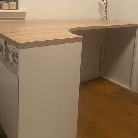Flot og lækkert lyst skrivebord. Yderst praktisk med hjørne lignende arbejdsplads. Funktionelle skuffer og plads til eksempelvis printer, ringbind eller bøger. Gemmer let rod af vejen og fungerer godt ind mod en væg eller fritstående.