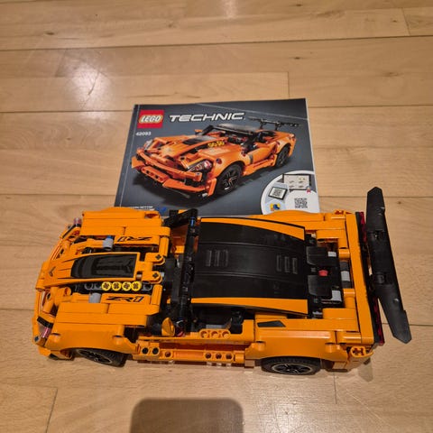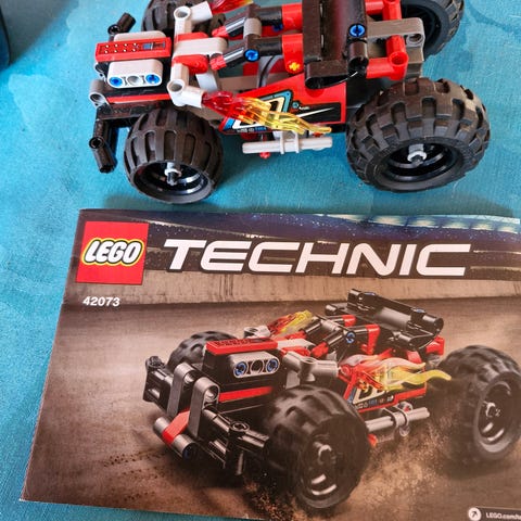 LEGO Technic bil 42090 i blå og sorte farver. Sættet består af en lille trækbil/racerbil med store dæk og trykaktiveret pull-back-funktion. Modellen har detaljeret karrosseri med klistermærker, frontbeskyttelse og bagende med motorlignende elementer. Velegnet som byggesæt og legetøj for børn, der kan lide tekniske LEGO modeller og køretøjer.