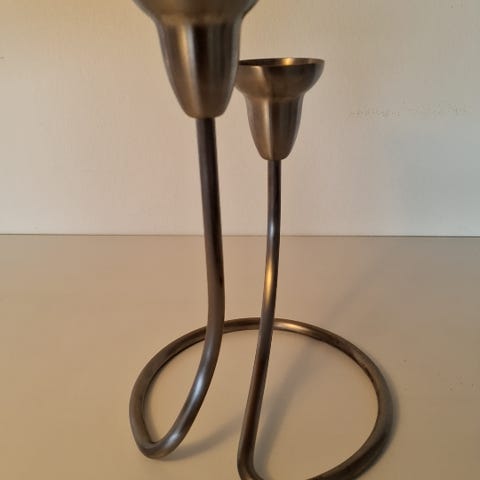Lysestagen har en slank, buet form i metal med en shiny, sølvfinish. Den har en skålformet holder til stearinlys.,Afhentes i:,Røde Kors Glostrup (161),Bemærk at mail, chat og beskeder ikke besvares, og varen skal købes på knappen "Gå til varen"