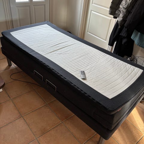 Sengen har en træramme med en lys, naturlig finish og en skummadras. 90 x 200 cm. Elevationsfunktionen er testet og virker. ,Afhentes i:,Røde Kors Bellinge (461),Bemærk at mail, chat og beskeder ikke besvares, og varen skal købes på knappen "Gå til varen"