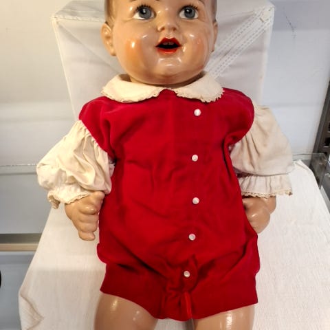 Dukken har en lang, hvid kjole med blåt bånd og dekorationer. Den har blont hår og en enkelt halskæde.,Afhentes i:,Røde Kors Glostrup (161),Bemærk at mail, chat og beskeder ikke besvares, og varen skal købes på knappen "Gå til varen"