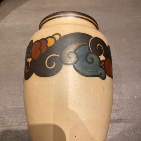 Keramik, vase, L.Hjorth, Bornholm, brun med motiv med frugter, brun, H: 5,5 cm dia. 4 cm. HELT INTAKT, Sælges for 50 kr. Sender gerne, dog ikke med fiks færdig porto oveni