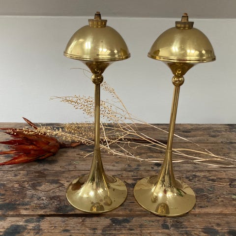 olielamper i sæt af to. Lamperne er pæreformede og messingfarvede med aftagelige låg og væger. Egnede som dekorative olielamper til indendørs brug, for eksempel på bord eller hylde. Materiale fremstår som metal med blank overflade. Olie fyldes gennem åbningen foroven, og vægen føres gennem låget.