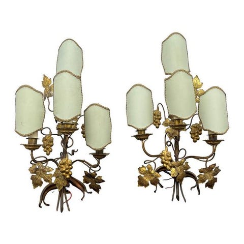 Smukt par væglamper lavet af smedet jern med guldblad-dekor, der efterligner grene med blade.