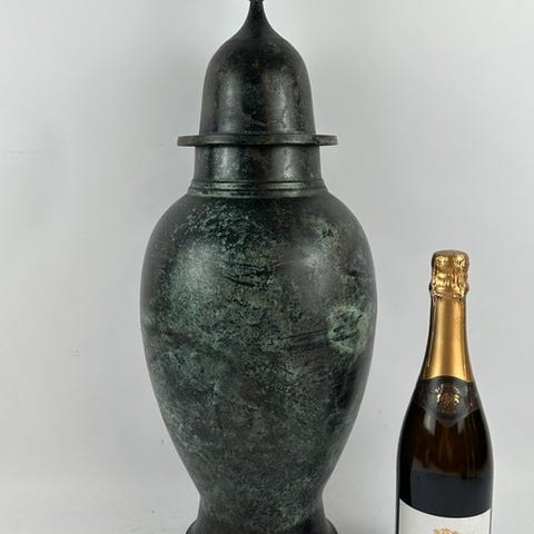 Særdeles smukke, meget dekorative og yderst elegante par lukkede vaser eller urner. Sættet er lavet af patineret metal med dybe, rige brune nuancer. Vi vurderer, at sættet er i generelt god stand med enkelte tegn på ældning. Se venligst billederne som reference.