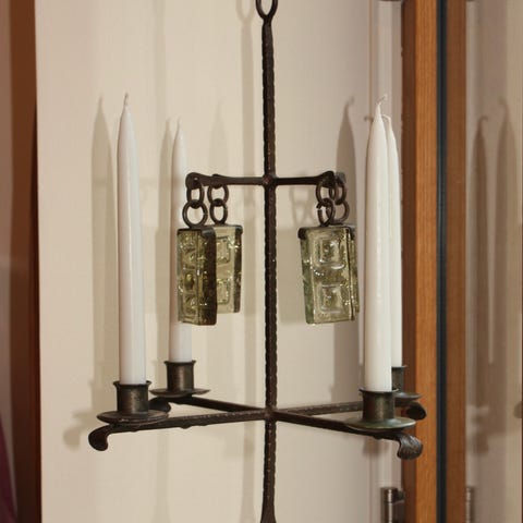 Fremstillet af farverigt smedet og malet metal (toleware). Armene er bladformede med sektioner af bobeches (drypbakker) i form af blade.