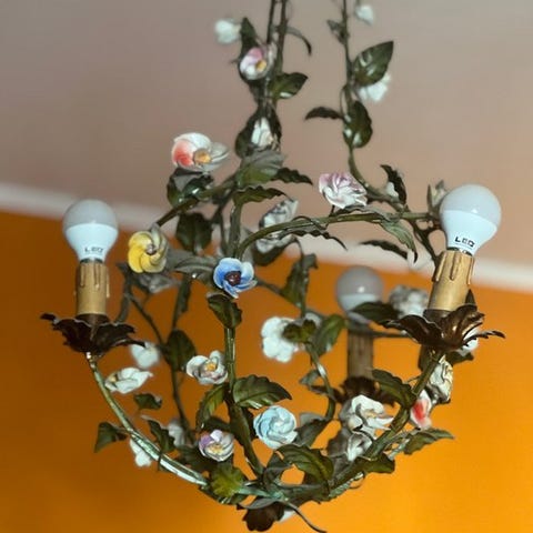 Vintage italiensk tre-lights lysekrone i grønt metal med Capodimonte porcelænroser på armene, mål 50 x 50 x 50 cm, periode 1940–1950, tilstand brugt med sandsynligvis små mangler, pergamenskærme i perfekt stand og i funktion. Klik på den blå "gå til varen" knap, for at købe eller byde på denne vare. Den samlede pris vil blive vist inden du afgiver dit bud.