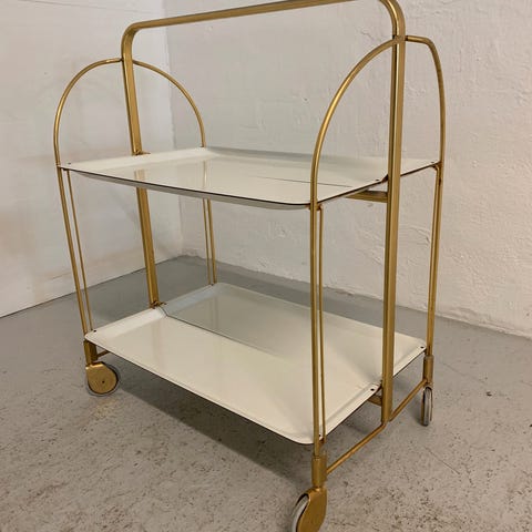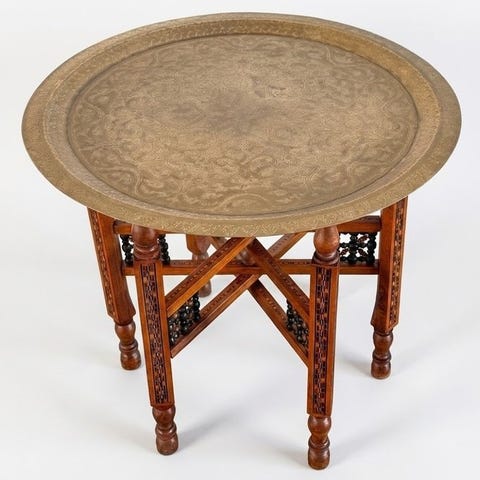 Sammenklappelig bord med messingbelagt top og marqueterede ben, oprindelse Marokko, dato omkring 1950–1960, god stand med mindre aldersrelaterede slid, diameter 50 cm, højde 47 cm, vægt 3,456 kg. Klik på den blå "gå til varen" knap, for at købe eller byde på denne vare. Den samlede pris vil blive vist inden du afgiver dit bud.