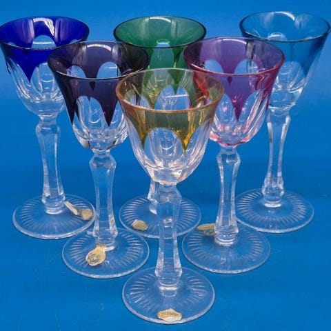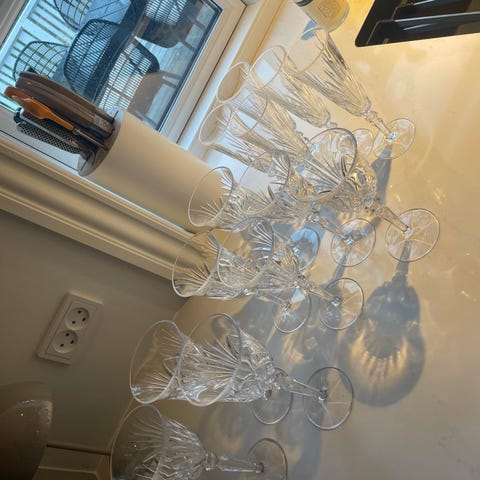 Acht Nachtmann krystalchampagneglas fra Vesttyskland (Bleikristall), højde 11,5 cm, diameter 9 cm, klare til blåhvid variant, dateret 1970–1980, alle i samme design og i fremragende stand med minimale tegn på slid og synlige chips eller revner som vist. Klik på den blå "gå til varen" knap, for at købe eller byde på denne vare. Den samlede pris vil blive vist inden du afgiver dit bud.