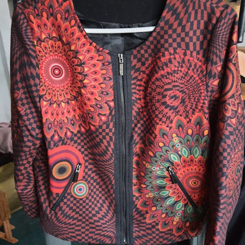 Jakke fra This is who I am. 100% bomuld. Den måler 57 cm fra skulder til bund. 50 cm (x2) over brystet og ærmelængden er 43 cm.