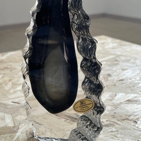 Den omhyggeligt udførte flerlagede glasdesign skaber en enestående dybdeeffekt og er et typisk kendetegn ved høj kvalitet Murano-glas-kunst fra midten af 1950’erne. Stykket er fritformet og håndlavet, hvert eksemplar er et unikt.