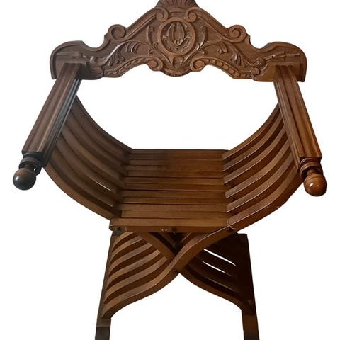 Savonarola-stol i mørkt valnøddetræ fra Italien, model Savonarola, håndudskåret dekorativ form; højde 89 cm, bredde 64 cm, dybde 34 cm, vægt 8 kg, dateret omkring 1950–1960, brugt stand med formodede små manglende dele. Klik på den blå "gå til varen" knap, for at købe eller byde på denne vare. Den samlede pris vil blive vist inden du afgiver dit bud.