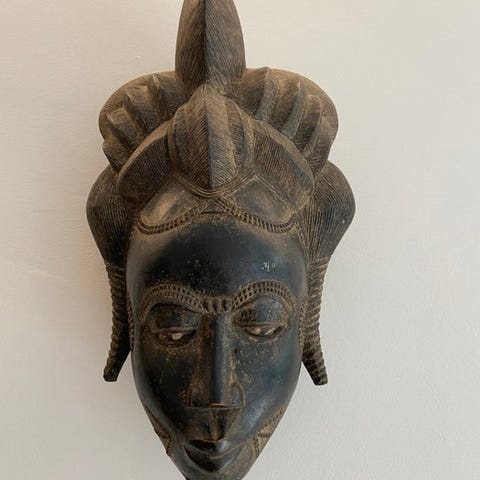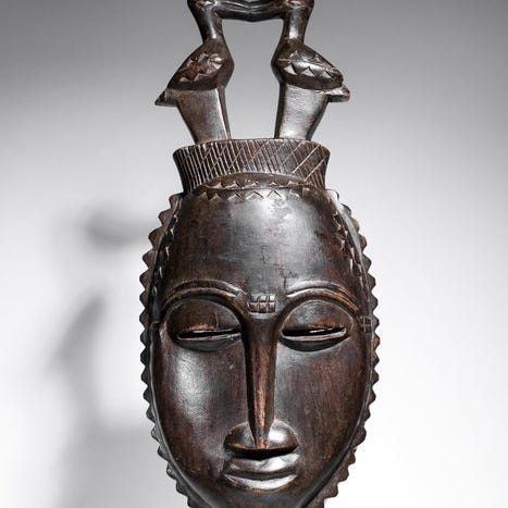 Baoulé maske fra Côte d’Ivoire, udhulet i træ, 32 cm høj og 12 cm bred, vægt 550 g, i fremragende stand med provenance til Collection Française (Mr Jean Louis VIOT) og certificering fra Galerie des Dominicains (Bruxelles). Klik på den blå "gå til varen" knap, for at købe eller byde på denne vare. Den samlede pris vil blive vist inden du afgiver dit bud.
